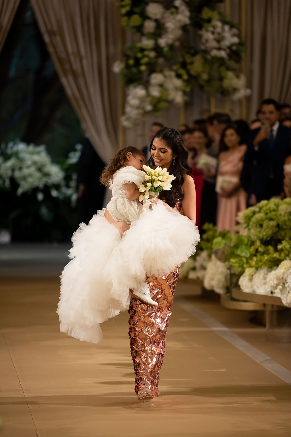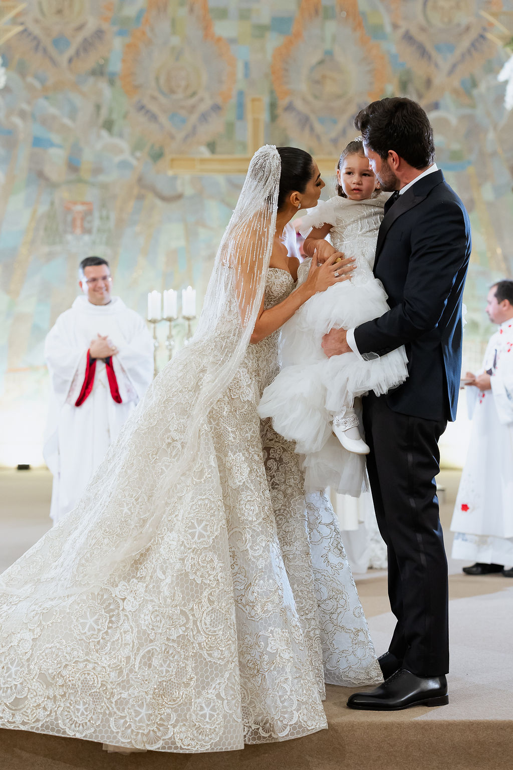 A cerimônia religiosa, marcada por um toque de emoção familiar, contou com a presença da filha do casal, Stella, de dois anos, que foi a protagonista de um dos momentos mais comoventes ao entrar com as alianças. “Esperamos que ela tivesse idade suficiente para participar, porque ela é a nossa maior aliança. Esse casamento foi muito mais do que um sonho meu, foi um ritual para a nossa família”, revelou Ana Gabriele, emocionada.