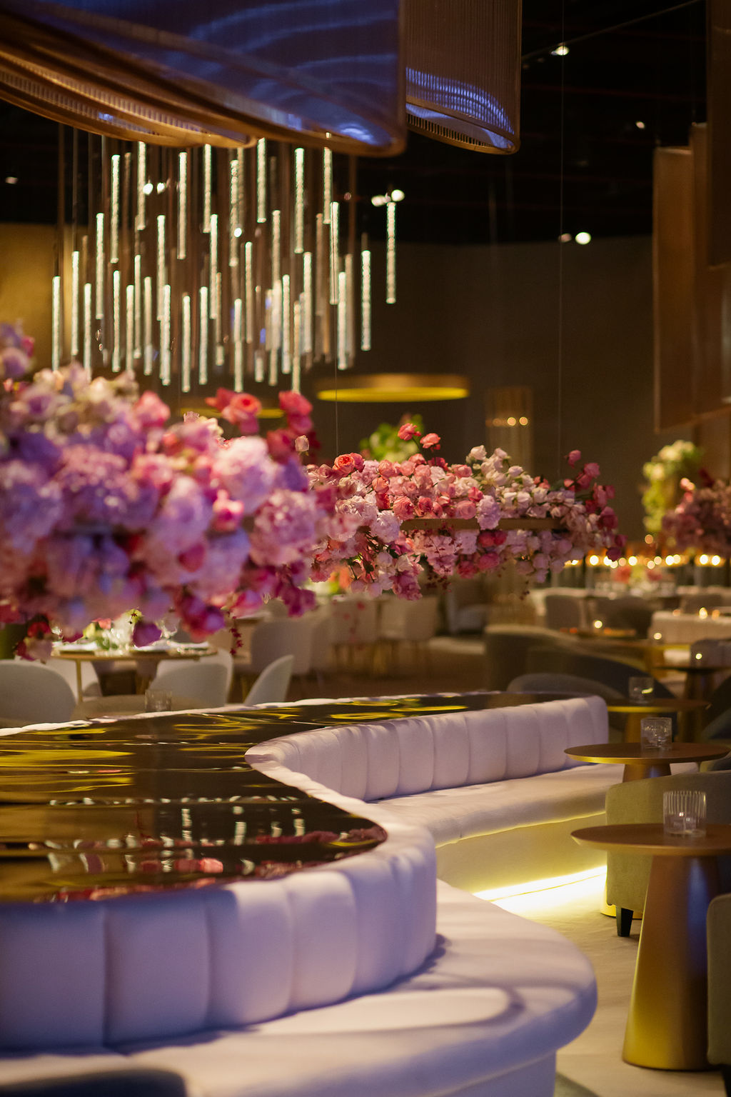 A decoração do evento traduziu em sua criação uma fusão entre o clássico e o contemporâneo, com toques de arte e design fluidos. “Eles me procuraram em busca de um projeto autoral, com referências de eventos internacionais e instalações de arte. Utilizei muito do design fluido, parametria e base cenográfica sob uma paleta de cores leve e marcante”, comentou o decorador Luis Fronterotta. A paleta de cores e a construção floral de volumes intensos, mas leves, criaram um ambiente inusitado e encantador.
